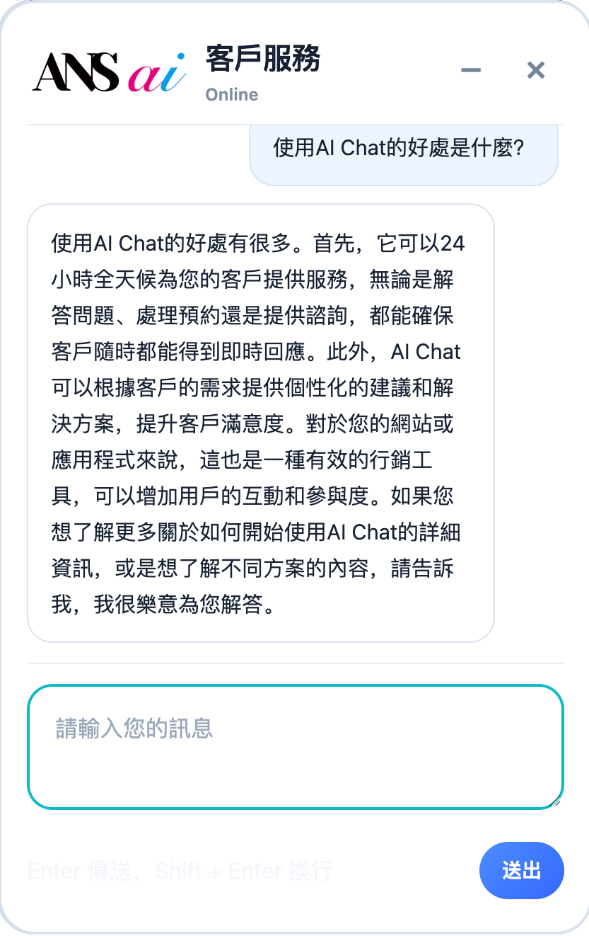 讓企業、品牌官網、電商平台、餐廳、門市與各類服務業,立即擁有全天候智慧客服系統。